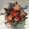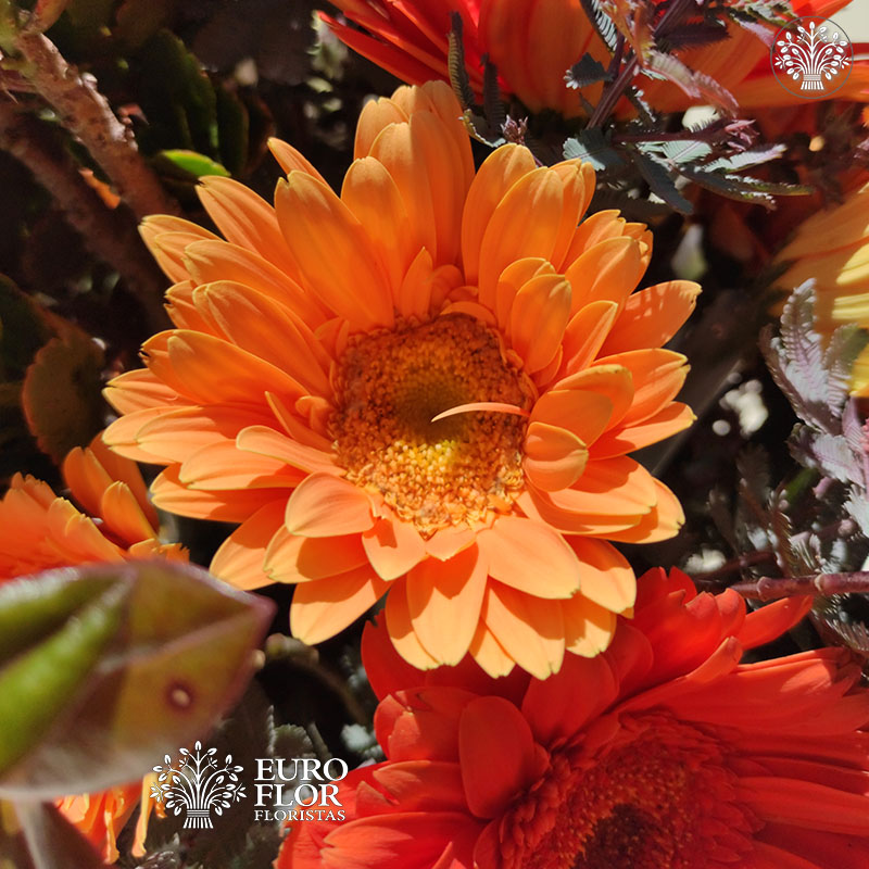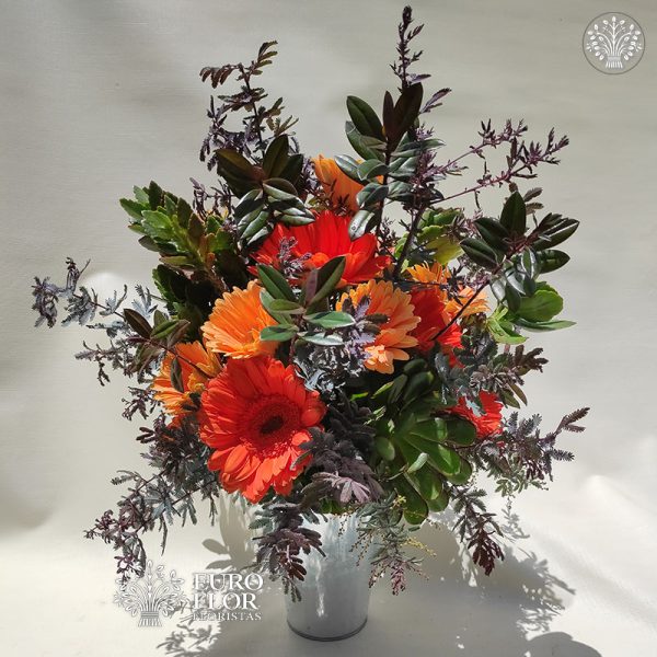 arreglo de flores gerberas y  proteas combinado con verdes en base de latón