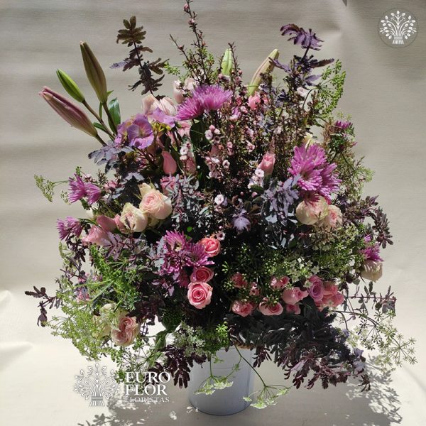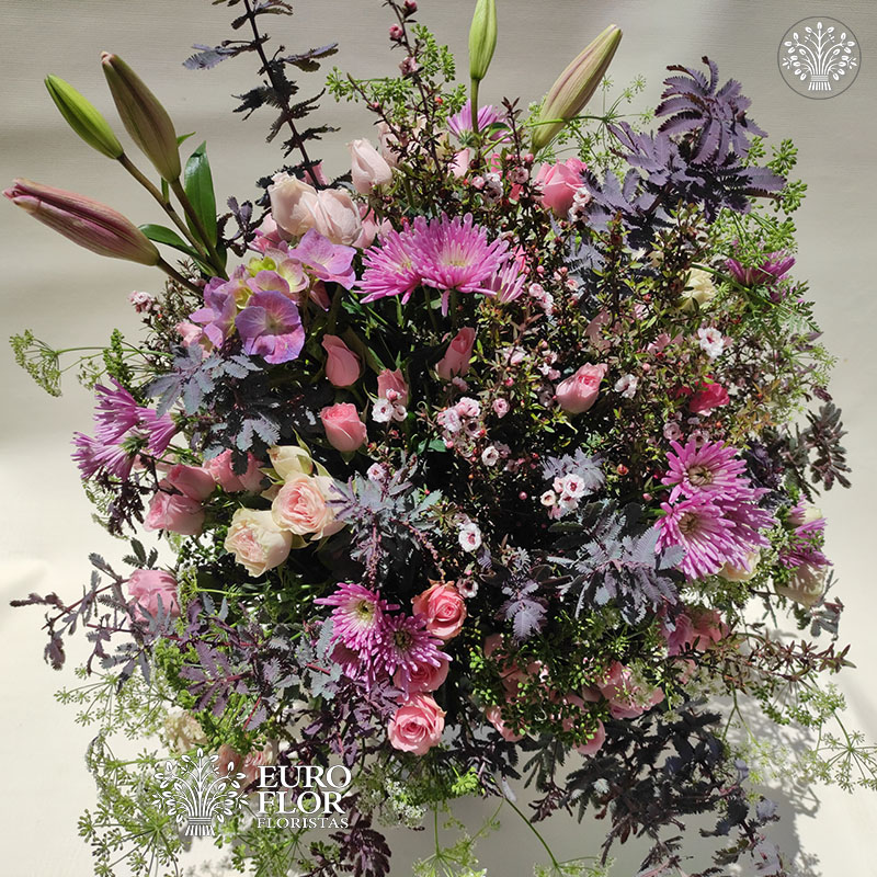 Combinación de flores y follajes en una base de latón importada, acacias plateadas, animajus, lirios, rosas spray, gerberas, daisys