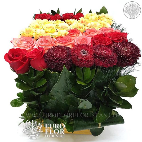 Pieza floral de forma cubista compuesta por rosas y gerberas, con follaje Premium.
