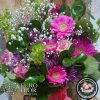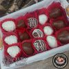 bouquet en vaso de vidrio, con elegante bandeja de 15 fresas con chocolate, botella de vino y dos copas.