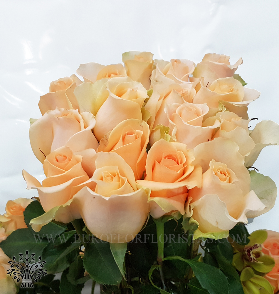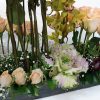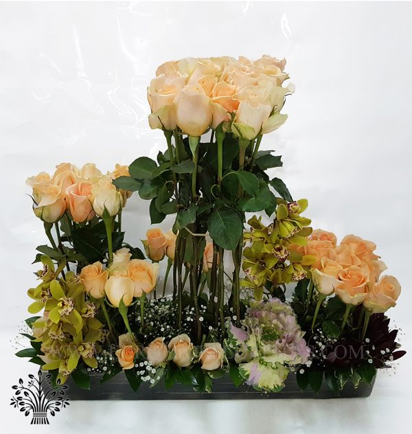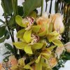 Pieza con rosas, repollo ornamental, orquídea con follaje Premium