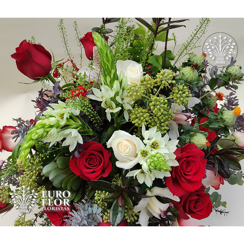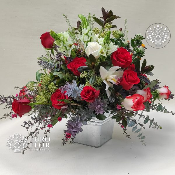 Arreglo en base de latón, compuesto por rosas, eucalipto baby blue y mucho amor.