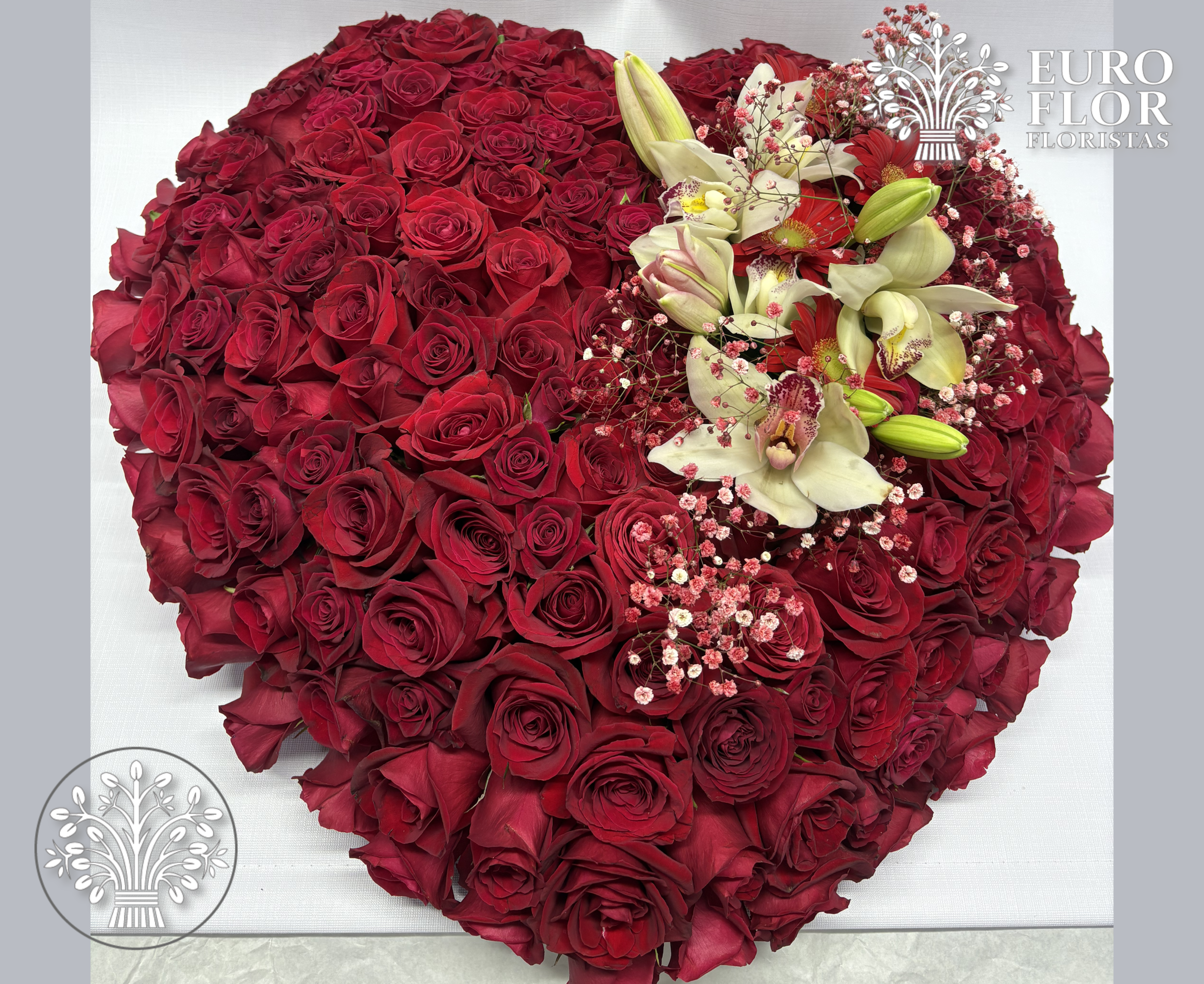 Arreglo en caja con forma de corazón elaborado con abundantes rosas rojas frescas, acompañado de delicadas orquídeas y flores complementarias. Un diseño elegante y romántico, perfecto para expresar amor profundo en ocasiones especiales.